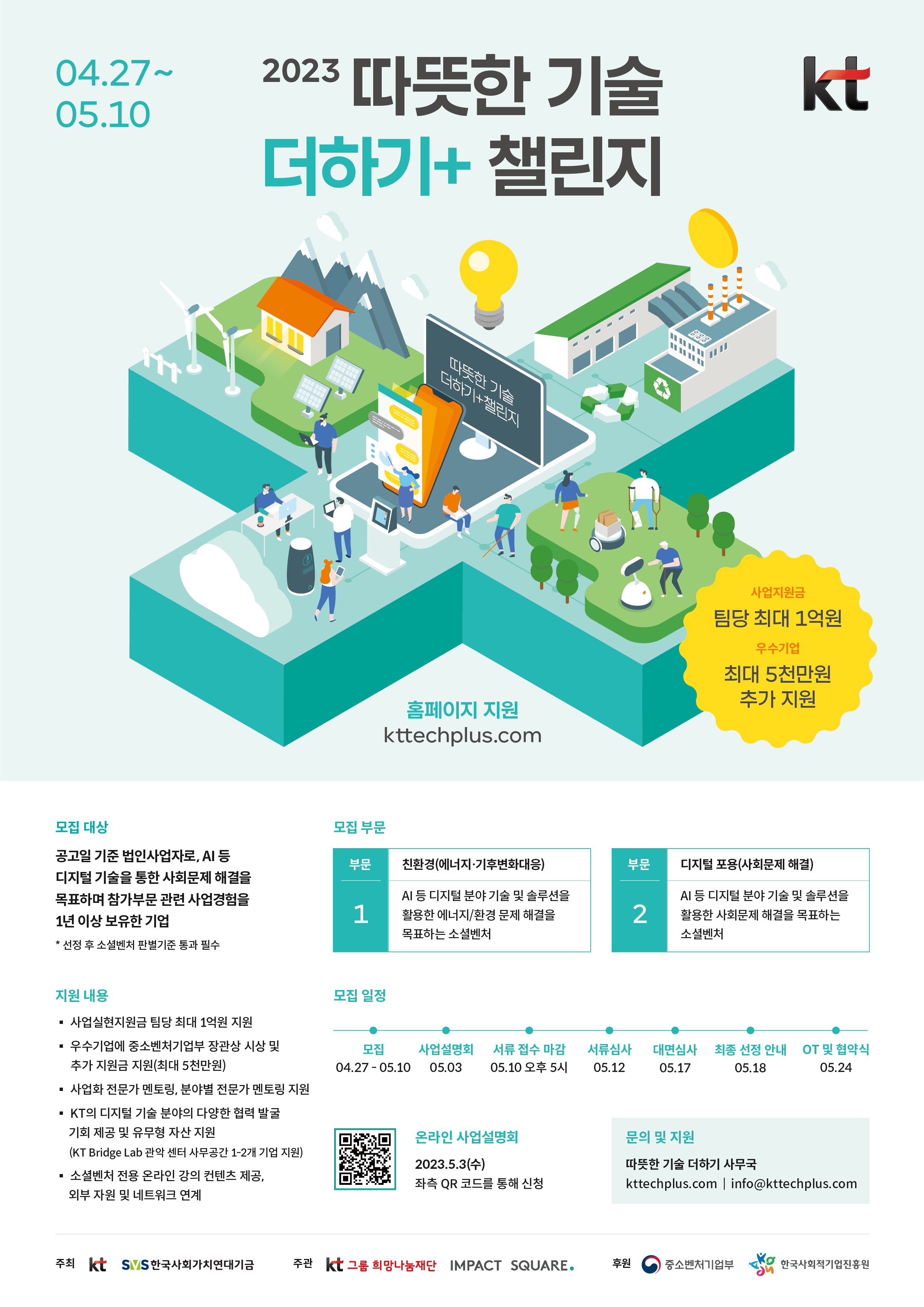 "2023 KT 따뜻한기술더하기 챌린지"는 ICT 기술을 활용하여 사회, 환경 문제를 해결하고자 하는 생태계 내 유망 소셜벤처를 발굴하고 지원하는 프로그램으로 올해로 3년차를 맞이하였습니다. 선정기업에는 사업지원금 최대 1억원이 지급되며 우수기업에는 중기부 장관 시상 및 추가지원금 지급과 함께 임팩트스퀘어가 직접 투자를 검토할 예정입니다.