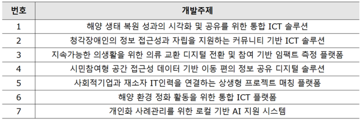 ※ 위 세부 주제 중 희망 주제를 선택하여 개발 진행※ 1팀 당 1건의 주제만 신청 가능하며, 신청서 내 주제 번호 기입 필요