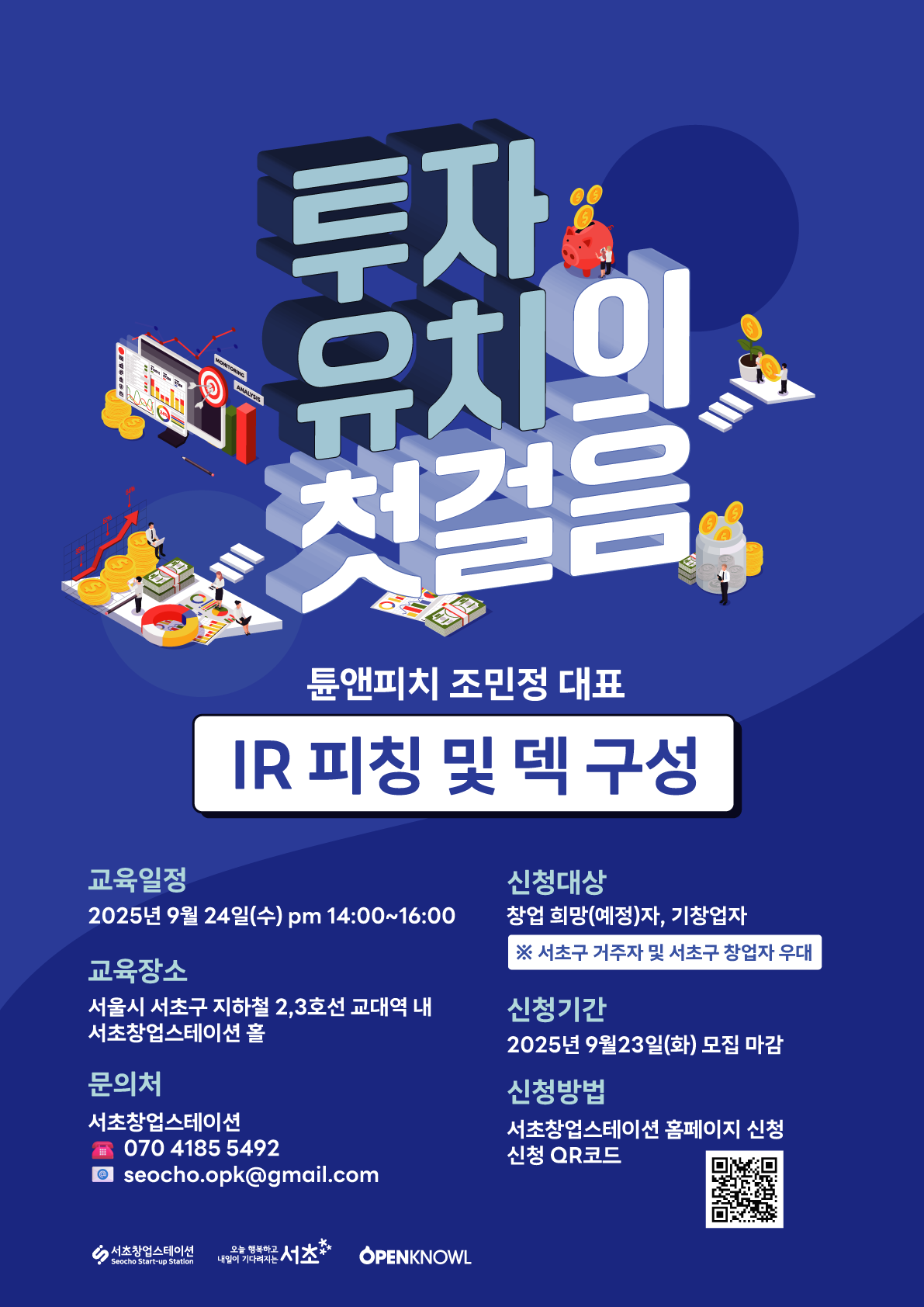 ■ 주제 : 투자유치의 첫걸음-IR 피칭 및 덱 구성■ 강사 : 튠앤피치 조민정 대표■ 일시 : 2025년 9월 24일(수) 14:00~16:00■ 장소 : 서초창업스테이션 홀(교대역 2·3호선 내 위치)[모집안내]■ 모집기간 : ~2025년 9. 23.(화)■ 모집규모 : 15명■ 신청자격 : 창업 희망(예정)자, 기창업자※ 서초구 거주자 및 서초구 창업자 우대[신청방법]- 서초창업스테이션 홈페이지 로그인 후 프로그램 신청https://www.xn--2i4bieu3bszgvtc6wlunby2r.com/sub_program/operate_view.php?idx=21- QR코드 신청 가능[선정안내]선정/미선정 모두 알림톡으로 안내 예정[문의처]서초창업스테이션T. 070-4185-5492 / E. seocho.opk@gmail.com (평일 9~19시)[유의사항] ※선정 후 사전 연락 없이 불참할 경우, 향후 프로그램 참여가 제한될 수 있습니다. 반드시 확인 후 신청해 주시기 바랍니다.
