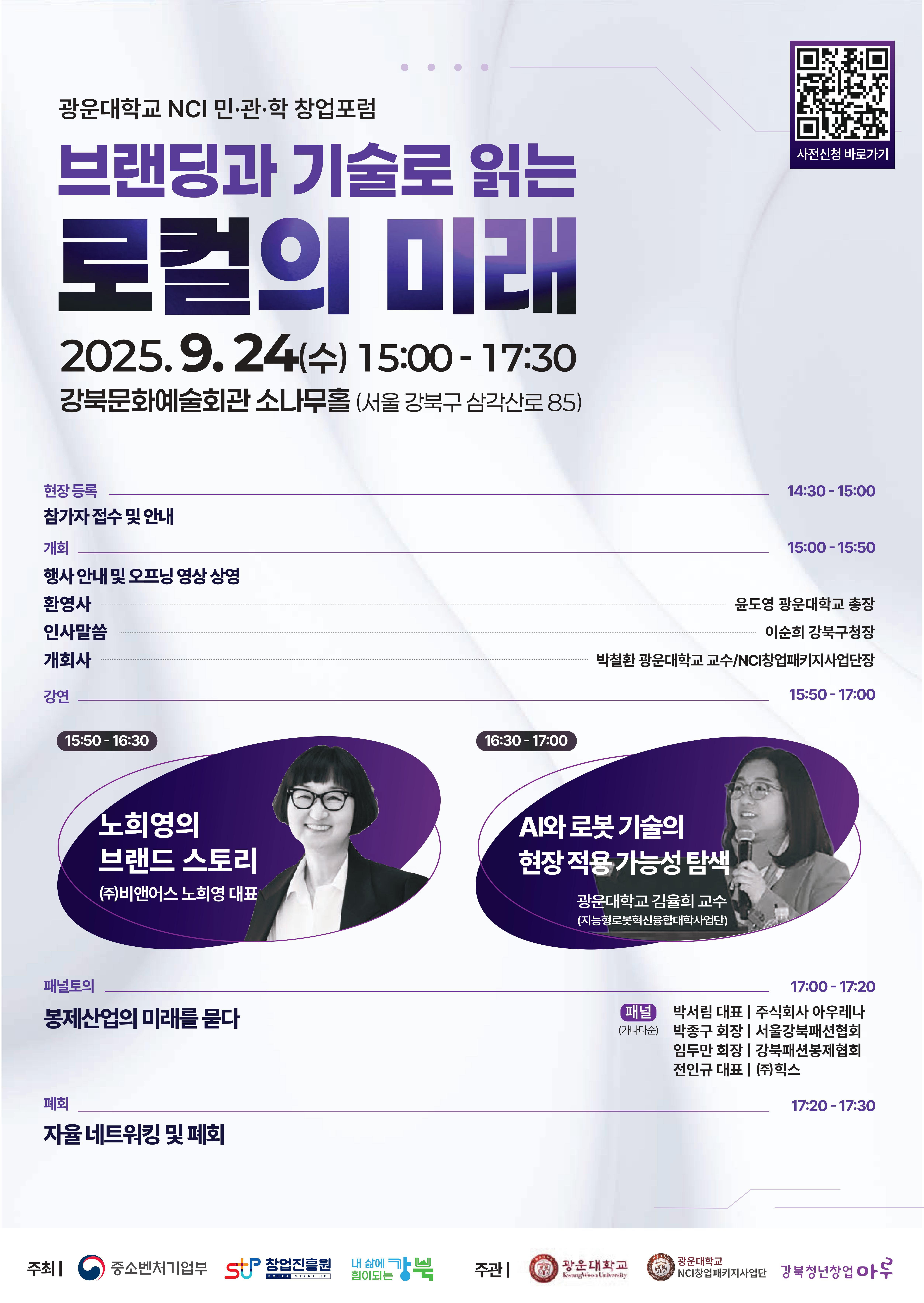 (15:00~15:50) 개회 -오프닝 영상상영, 환영사(윤도영 광운대총장), 인사말씀(이순희 강북구청장), 개회사(박철환 광운대학교 교수/NCI창업패키지사업단장)